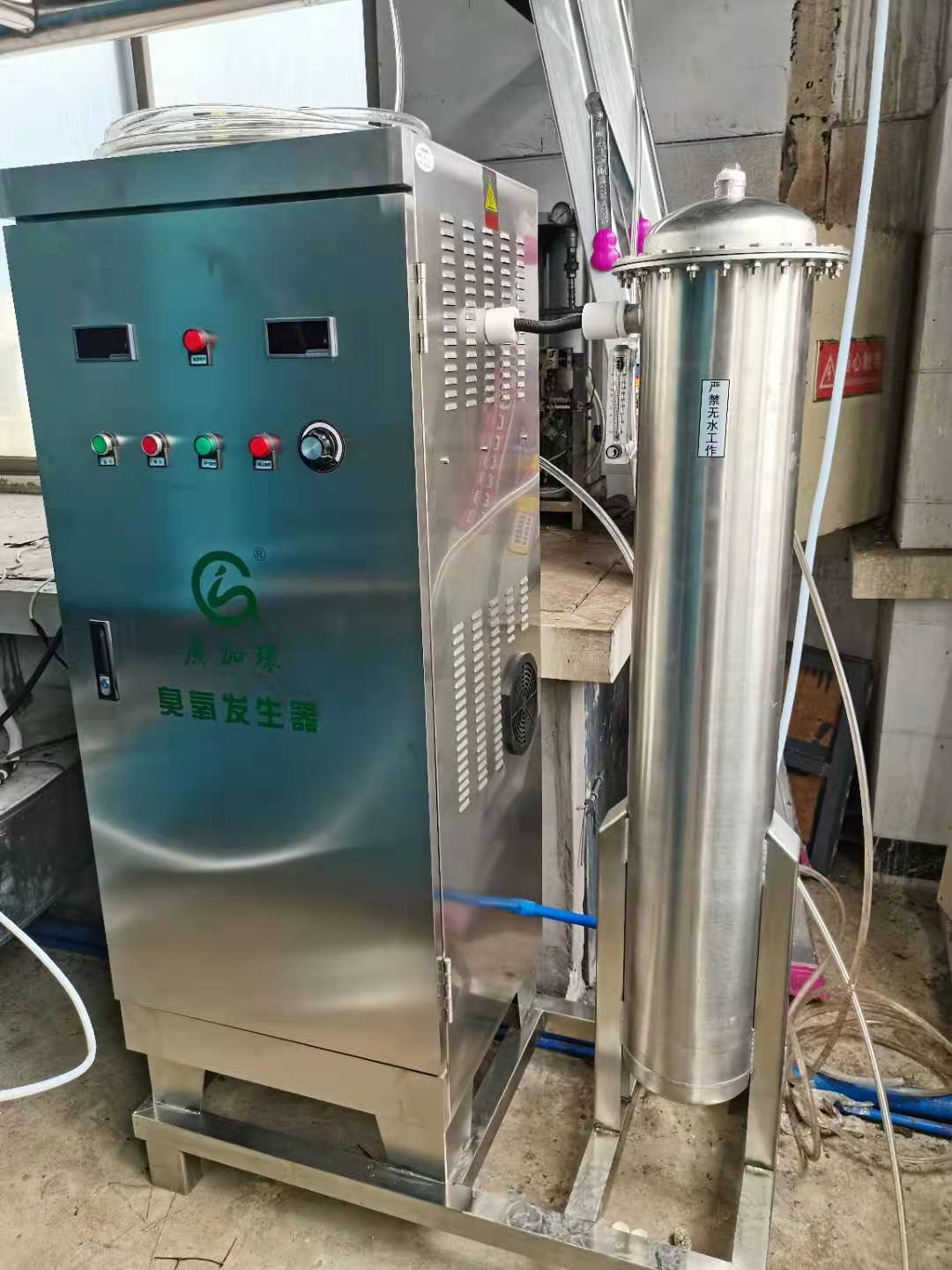 此前這家洗水廠公司用了一套200克空氣源臭氧發生器,因擴大廠房,從新塘搬遷到增城,新增一臺400g空氣源臭氧機hoh臭氧發生器_臭氧消毒機_臭氧水機_制氧機_廣州佳環電器【官網】